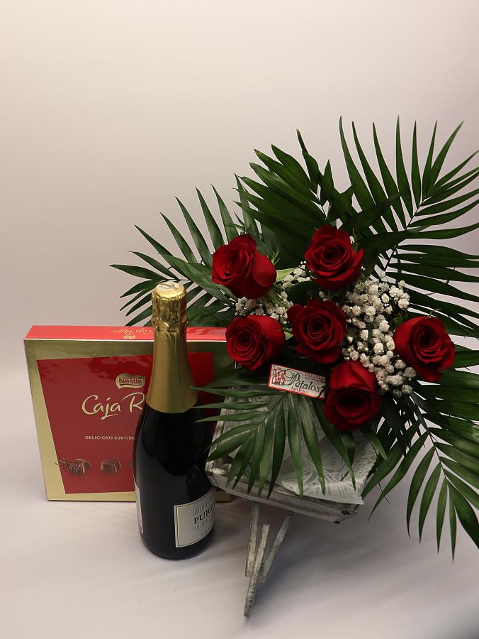 Espectacular bouquet de 6 rosas, acompañado con botella de cava, peluche y bombones para sorprender a tu pareja, a tu amiga en un acontecimiento .