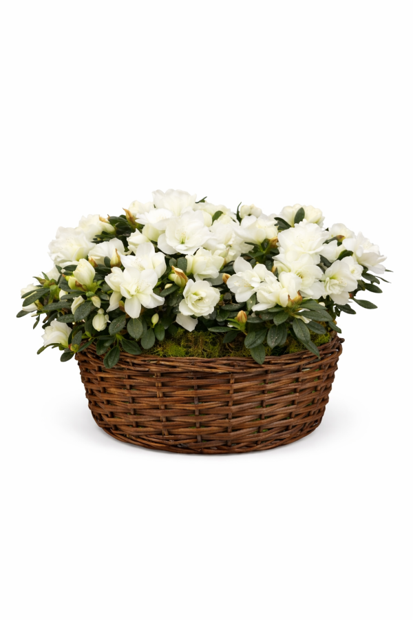 Arreglo de azaleas de color blanco, en una base de mimbre, según disponibilidad y siempre adecuada al conjunto de plantas. Es un regalo sencillo pero ideal para tener un buen detalle o bien para decorar una estancia de tu casa u oficina.