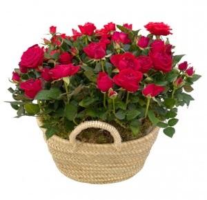Estupendo conjunto de rosales enanos en color rojo, colocados en una bonita cesta de mimbre que hará de tu regalo una sorpresa increíble.