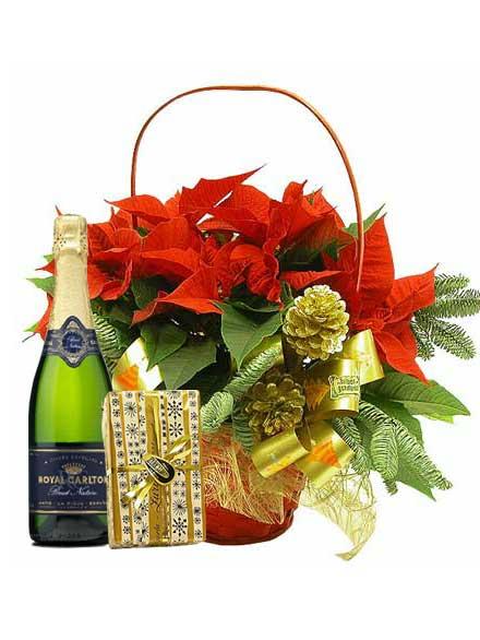 Preciosa cesta de Navidad con flores de Pascua acompañada de una botella de cava y bombones