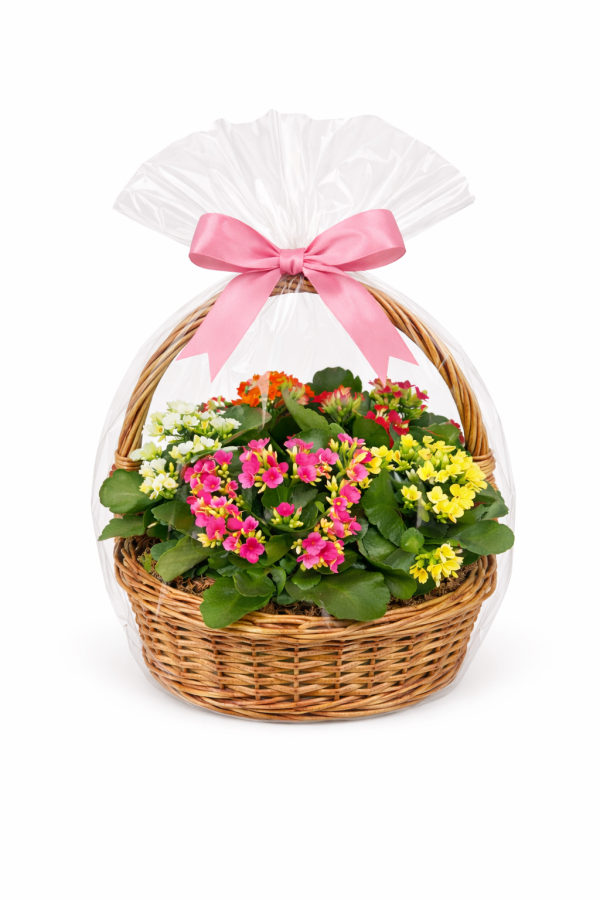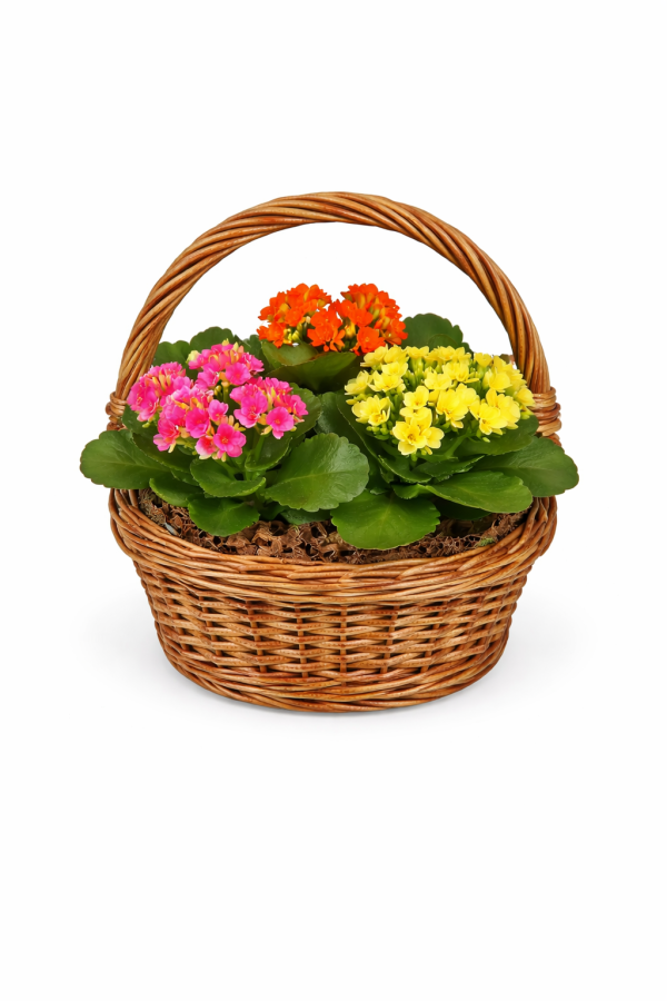 La cesta de mimbre con plantas Kalanchoe combina la belleza natural de los colores vivos con el encanto artesanal del mimbre. Cada cesta incluye una selección de kalanchoes en flor —rosas, naranjas, amarillos o rojos— creando un conjunto luminoso y perfecto para decorar cualquier espacio interior.