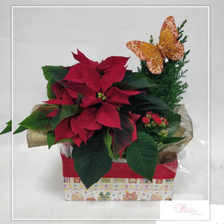 Preciosa cesta para Navidad. Compuesta por una flor de Pascua y un kalanchoe. Adornado en una preciosa caja y algunos adornos puestos con todo el mimo.
