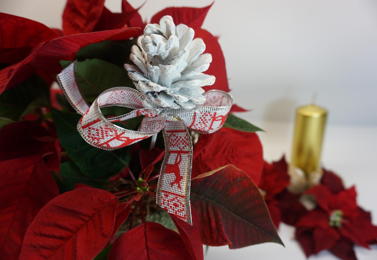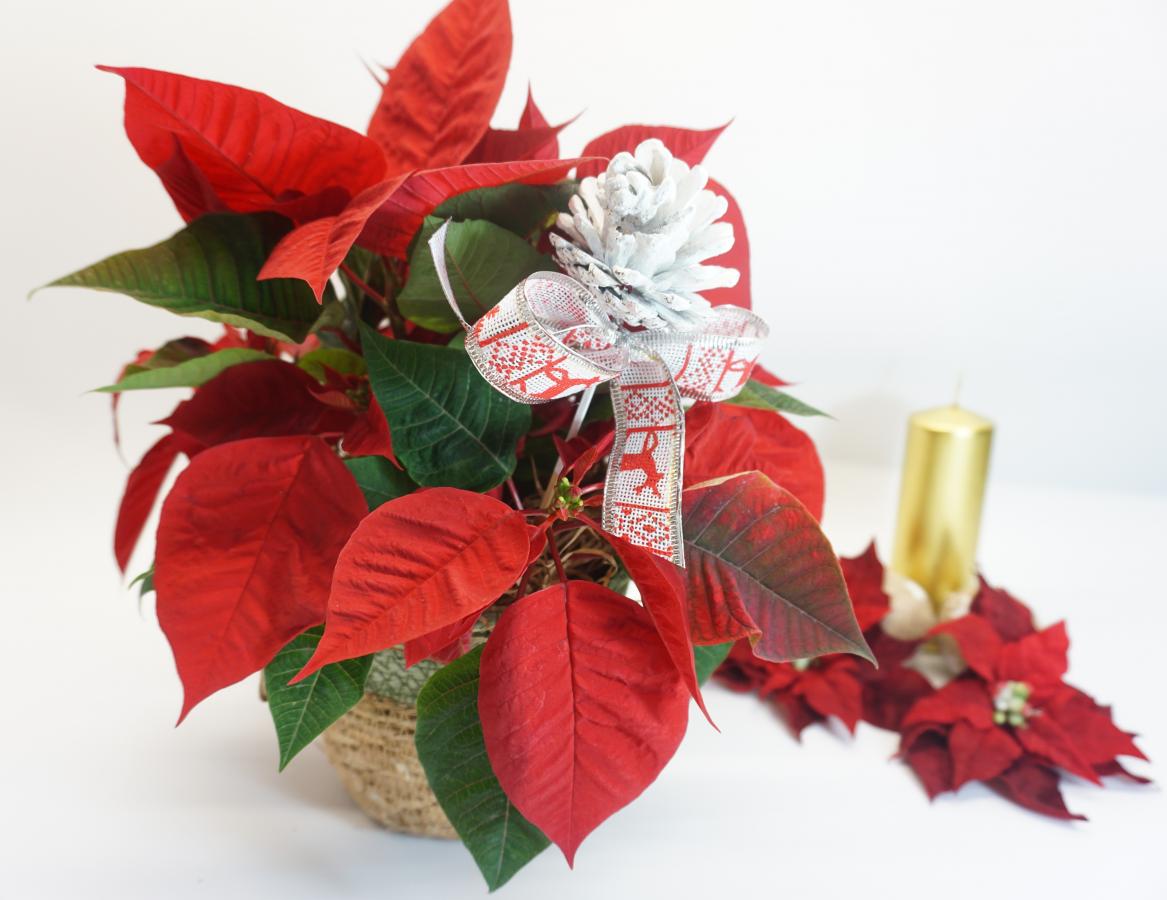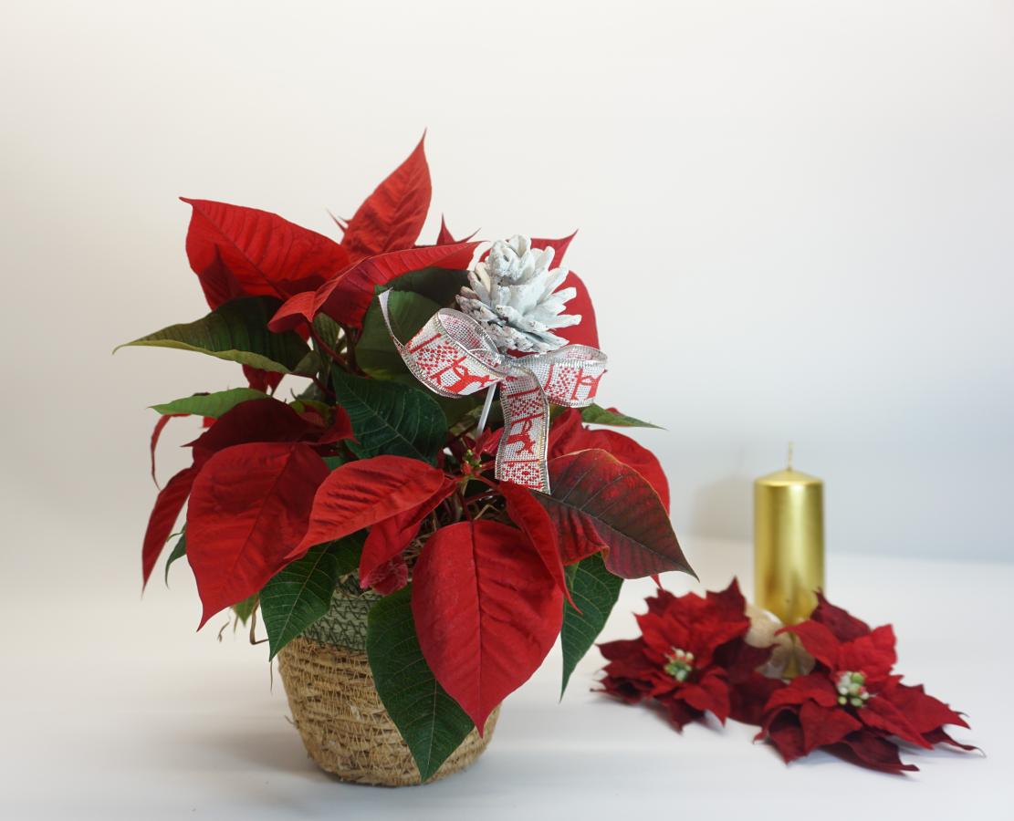 Flor pascua decorada para una regalo. La tradicional flor de pascua no debe faltar en ningún hogar en las fiestas navideñas. Queda perfecta en cualquier sitio. No incluye complementos para realizar la fotos (vela)
