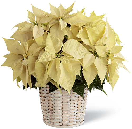 Sorprende con esta elegante poinsettia blanca, decorada con espíritu navideño. Es una de las flores de Pascua que más gusta por su color diferente a la clásica planta.