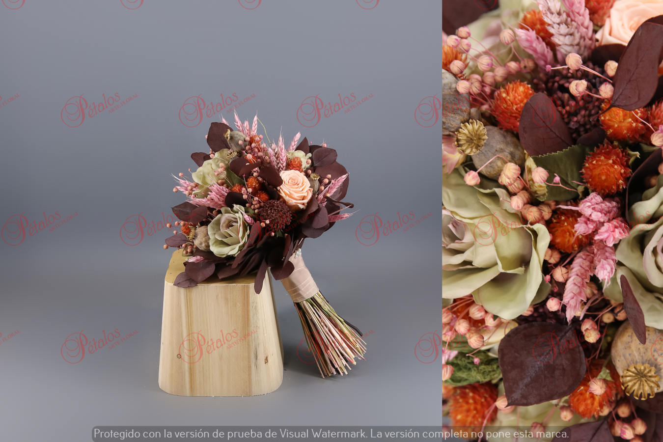Ramo de novia hecho con flores secas o preservadas. Un ramo único y especial que no solo durará un día, sino que las flores naturales tratadas previamente harán que dure toda la vida.