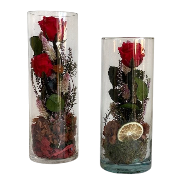 Espléndido arreglo formado por dos rosas preservadas incluidas en un elegante jarrón de cristal. Ideal para regalar.